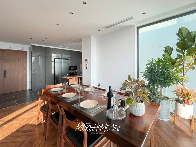 Bên cạnh đó, gam màu trung tính và ánh sáng tự nhiên cũng trở thành xu hướng chủ đạo trong không gian phòng ăn. Việc kết hợp ánh sáng từ đèn trang trí với ánh sáng mặt trời không chỉ giúp không gian trở nên ấm cúng mà còn tạo cảm giác gần gũi, thân thiện cho bữa ăn gia đình. Thêm vào đó, việc sử dụng các yếu tố thiên nhiên như cây xanh hay gỗ tự nhiên trong thiết kế nội thất sẽ mang đến một bầu không khí sống động, giúp gia chủ cảm nhận được sự giao hòa giữa con người và thiên nhiên ngay trong căn phòng của mình.